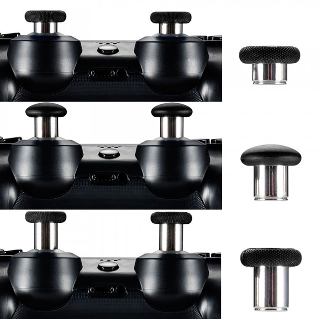 Хочете грати на DualShock 4 зі стиками від геймпада Xbox One Elite? Хочете, щоб стики були вищими? З цими стиками ви зможете швидко сконфігурувати висоту та форму стиків під будь-який тип гри. Конструкція дає змогу замінювати "на льоту", досить докласти мінімального зусилля, щоб від'єднати магнітний замок і замінити "грибок" на інший. Насадки дуже надійно розміщуються в кріпленні, що абсолютно виключає випадкове від'єднання. До комплекту входять 3 пари насадок різної висоти (стандартні, середні, високі).